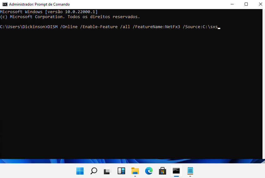 02: Abrir o cmd como administrador e executar o seguinte comando substituindo o e:\sources\sxs pelo caminho da pasta:
