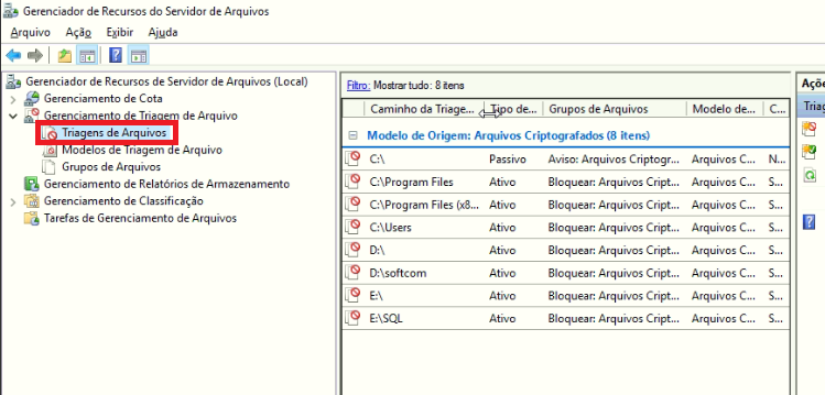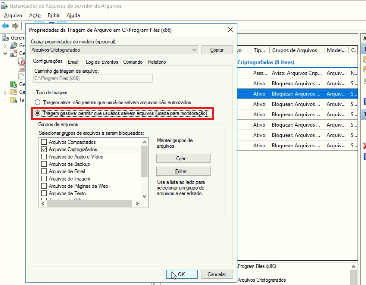 4 - Clicar em "Modelos de Triagem de Arquivo", clicar em "Bloquear arquivos Executáveis" e em "Bloquear Criptografados" em clicar em "Editar propriedades do Modelo".