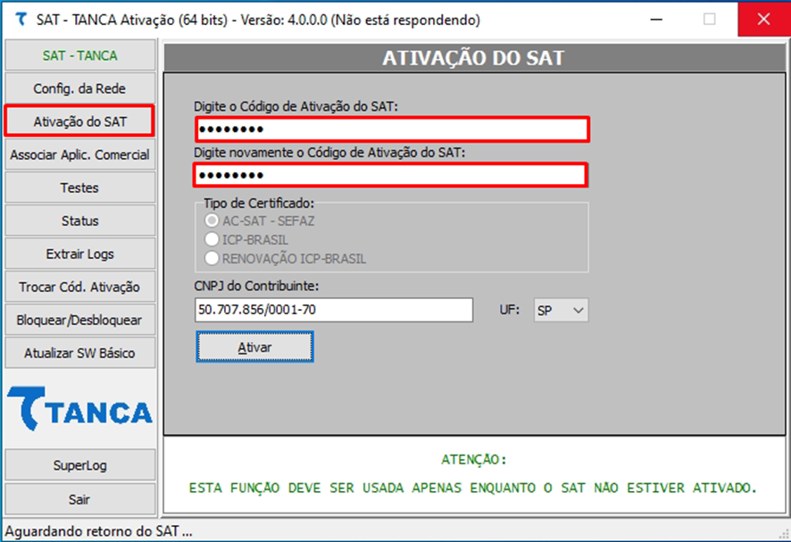 10- Clicar no botão "Ativação SAT" e informar e confirmar o código de ativação. No campo "tipo de certificado", deve ser selecionado o mesmo tipo informado na hora da vinculação no sistema de retaguarda da SEFAZ(SGR-SAT). Informar o CNPJ do Contribuinte e informar a UF "SP". Clicar no botão "Ativar" e aguardar aparecer mensagem que o procedimento foi corretamente concluído