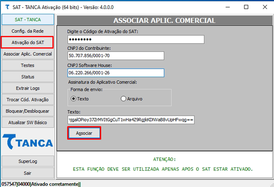 11- Clicar em "Associar Aplic. Comercial", informar o código de ativação, informar o CNPJ do Contribuinte, como CNPJ da Software House informar o CNPJ da Softcom (06220266000126), deixar a forma de envio como "Texto" e informar no campo "Texto" a assinatura SAT obtida na "OBS3". Clicar no botão "Associar" e aguardar conclusão
