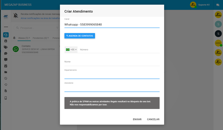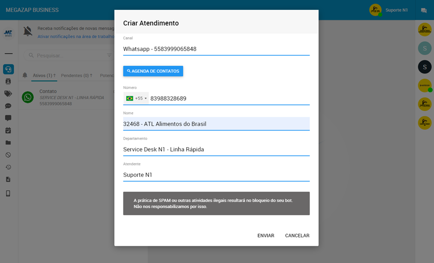 è O nome do cliente deverá ser inserido no padrão “Registro do Cliente + Nome da Empresa” – Com isso, o número do cliente já ficará salvo no cadastro do MegaZap;