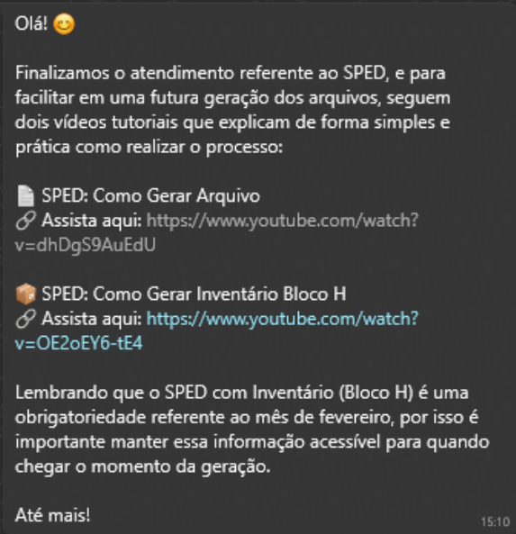 Quando um atendimento SPED chegar para um atendente que não está no rodízio, este deverá enviar o comando #transferirsped para que a conversa seja direcionada para o atendente responsável no dia.