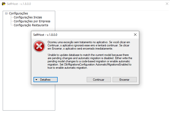 SELFHOST > CONFIGURAÇÃO: ERRO "Ocorreu uma exceção sem tratamento" AO CONFIGURAR EMPRESA NO SELFHOST DbMigration