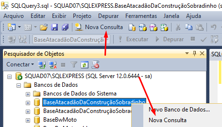 3 - Localizar o banco do cliente que será feito o processo, clicar com o botão direito sobre ele e selecionar a opção Nova Consulta;