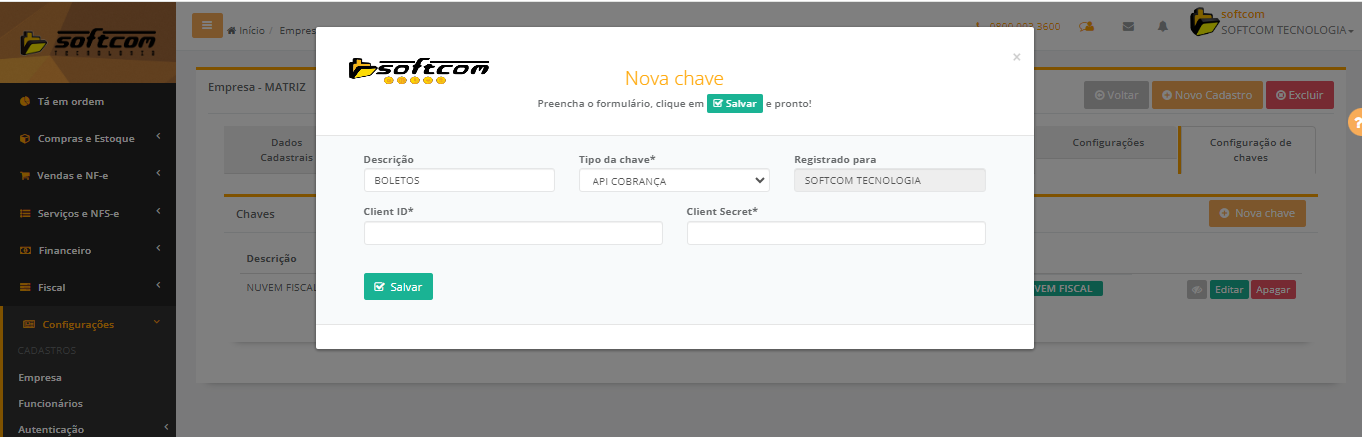 - No cadastro da empresa > Configuração de Chaves > Nova Chave > Inserir a chave gerada da API Cobrança no Portal de Serviços da Softcom >
