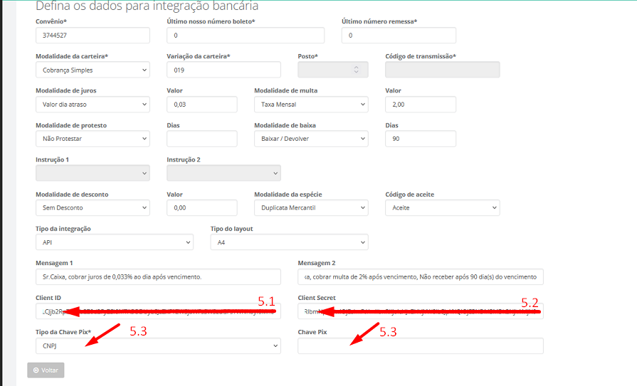 As chaves devem ser preenchidas no ponto 5.1 e 5.2, caso o cliente deseje pode ser anexado também a chave PIX selecionando o tipo da chave e inserindo-a no campo 5.3.