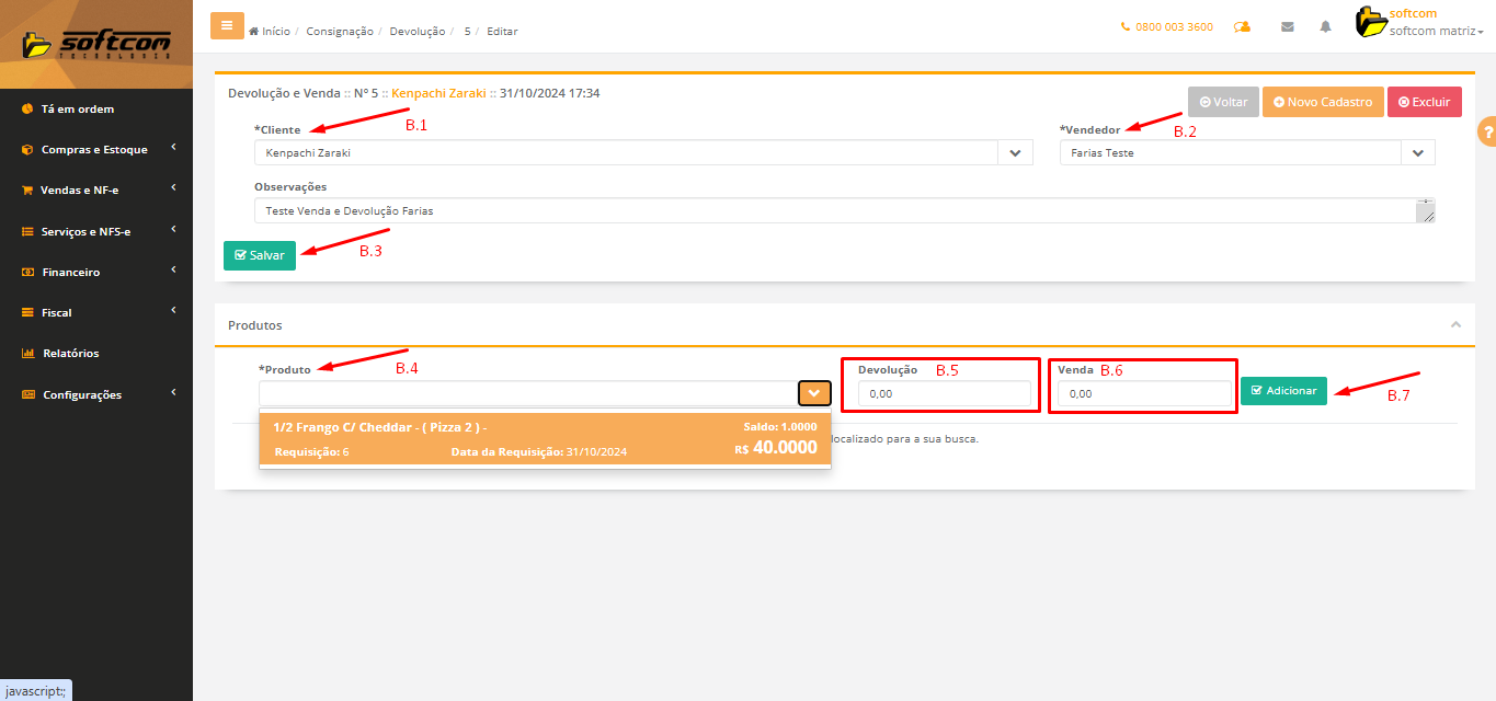 - Após lançar o cliente B .1 ; Vendedor B .2 e "Salvar" B .3 , será possível lançar os produtos B .4 . Basta ir até o campo *Produto, pesquisar um item que (possui saldo de requisição para esse cliente) e escolher a quantidade que será devolvida ao estoque B .5 ou será que transformada em venda B .6 e confirmar no botão Adicionar B .7 ;