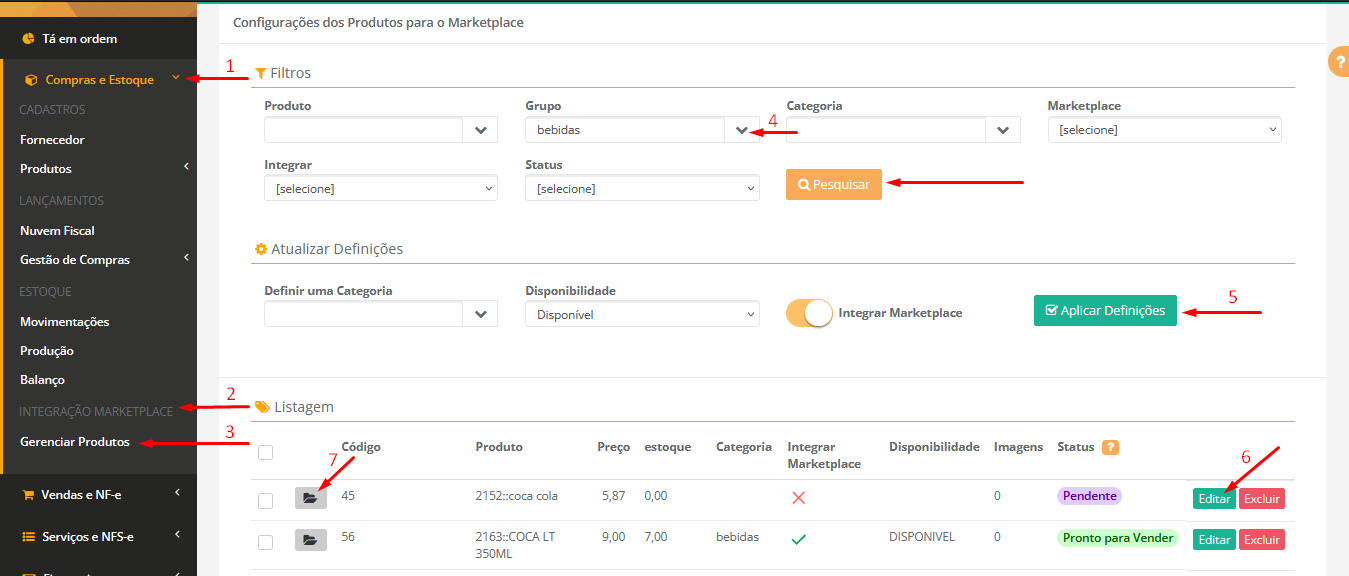 1 Compras e Estoque 2 Integração Marketplace 3 Gerenciar Produtos 4 Filtrar por algum tipo presente e clicar em Pesquisar 5 Aplicar Definições que foram selecionadas para os filtros realizados 6 Editar o item do resultado presente na listagem 7 Editar o item direcionando diretamente para o cadastro dele mesmo.