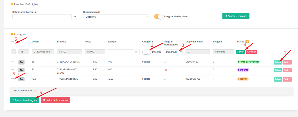 1 Editar como o item será enviado ao Marketplace 2 A categoria que irá pertencer e se irá Integrar ao Marketplace 3 Disponibilidade se subirá o item já disponível para venda ou não 4 Salvar as alterações realizadas 5 Selecionar todos os itens da listagem ou 5.a Selecionar unicamente um único item 6 Aplicar Atualizações que irá realizar o envio dos dados ao Marketplace de destino que foi previamente configurado nos canais de venda, conforme pode ser consultado no FAQ.
