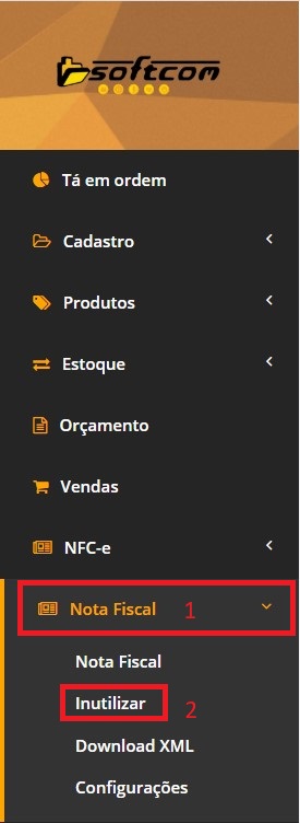 1 - Acesse o menu lateral va em nota fiscal (1), e inutilizar (2).