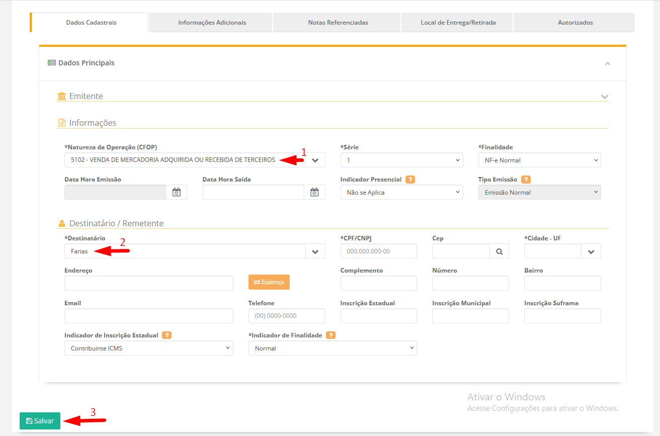 1 Informar a Natureza da Operação(CFOP) 2 Informar Destinatário, Observar os campos Indicador de Inscrição Estadual e indicador de Finalidade. 3 Salvar