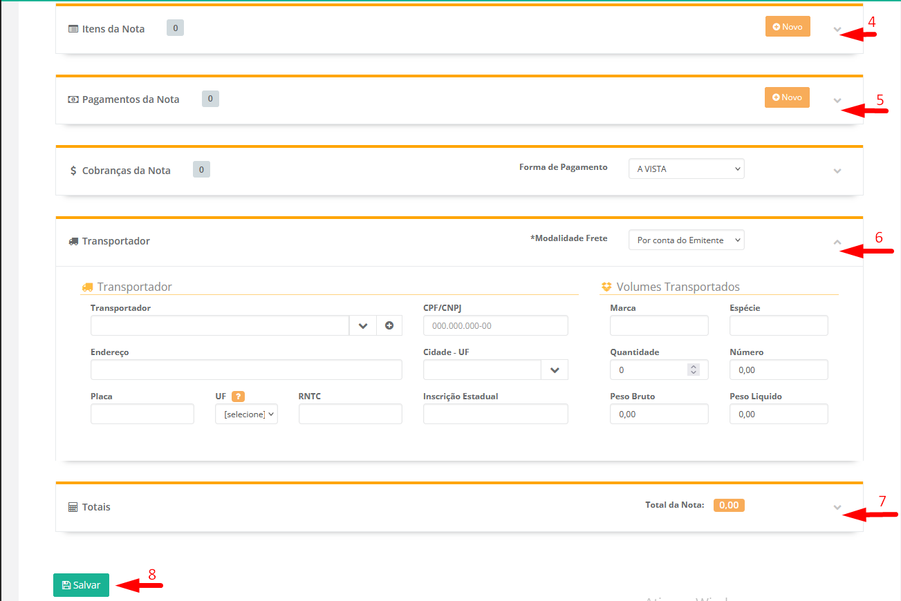 4 Informar os Itens da Nota. 5 Informar Pagamentos se necessário exibir na NFe a forma de Pagamento. 6 Informar Transportador 7 Informar Totais, Para destaque de Impostos em nota de devolução/para destaque de Impostos 8 Salvar
