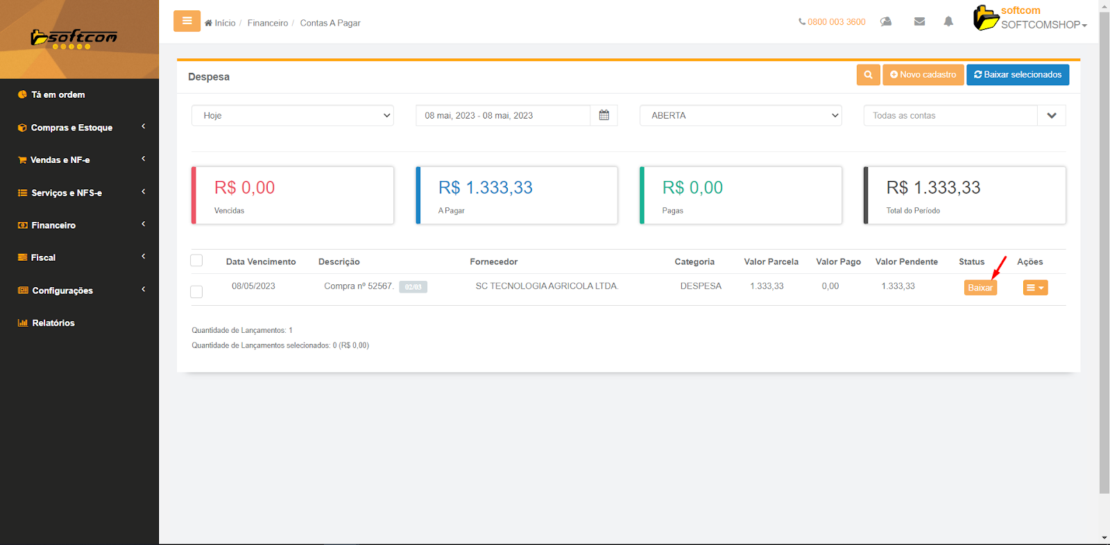 Softcomshop>Financeiro>Contas a pagar: Como realizar baixa das despesas?
