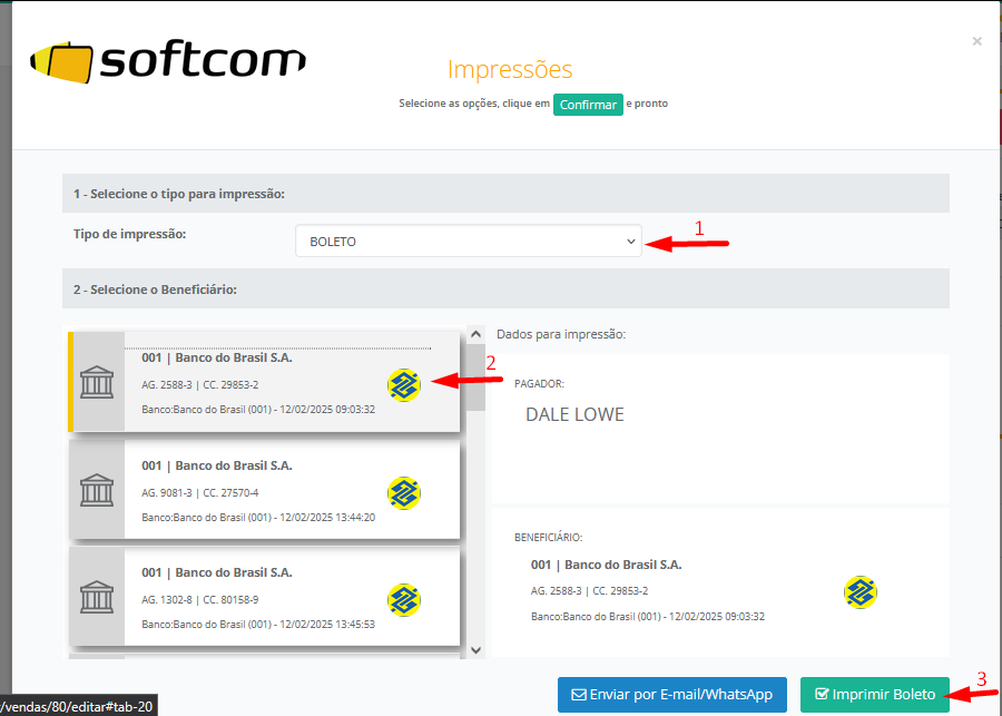 Na venda deverá ser utilizado a forma de pagamento Boleto para pode gerar na impressão o vinculo com o banco cadastrado.