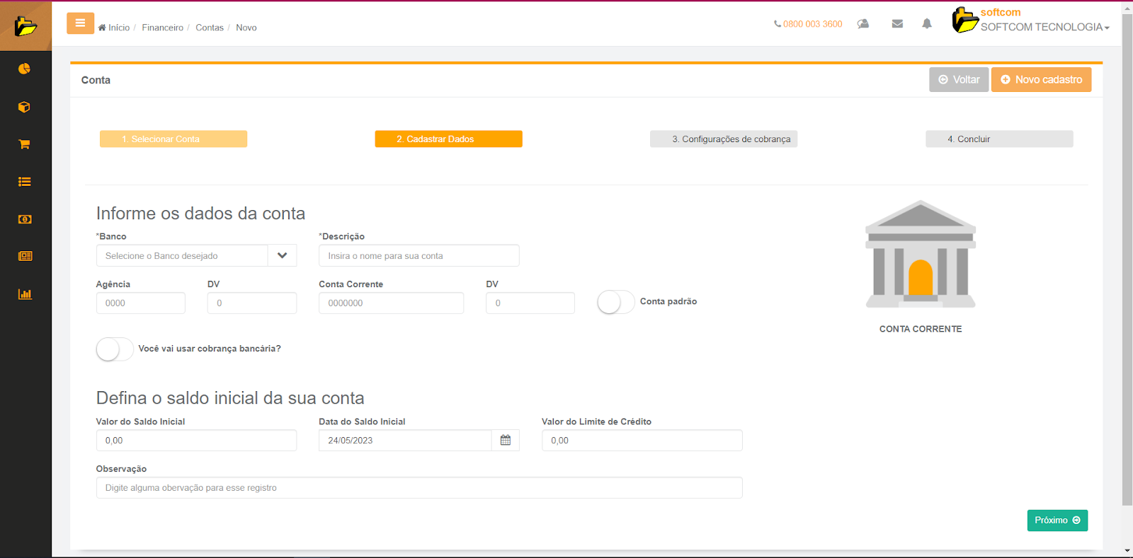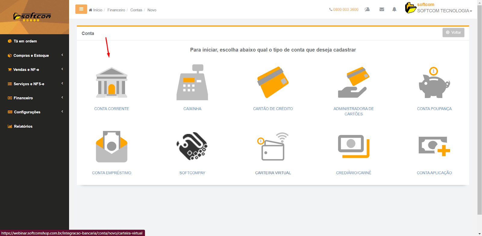 4-Na tela de cadastro, teremos várias opções de contas, para o uso de boletos, clicar em Conta Corrente
