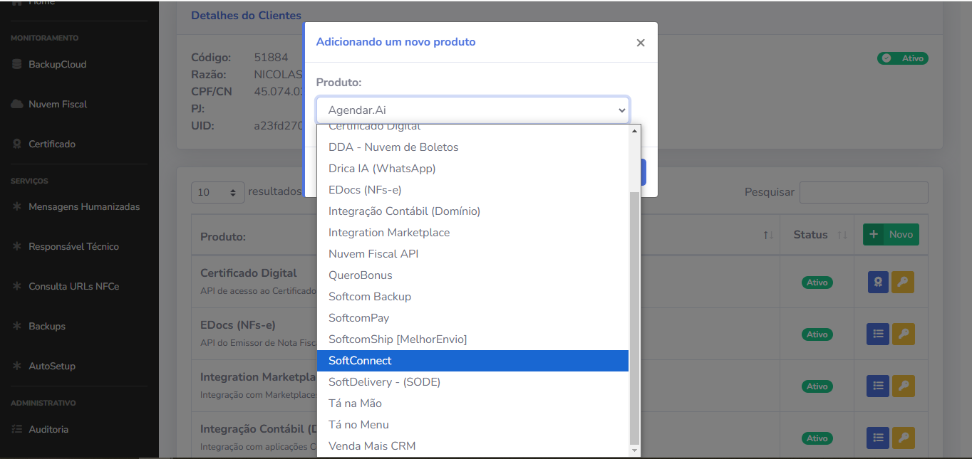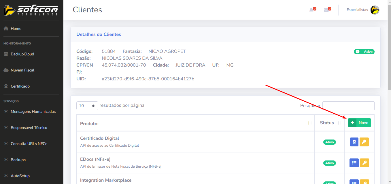 3 - Ao acessar o cadastro do cliente, cliente no botão novo para inserir o Produto Softconnect, como mostra a imagem a seguir