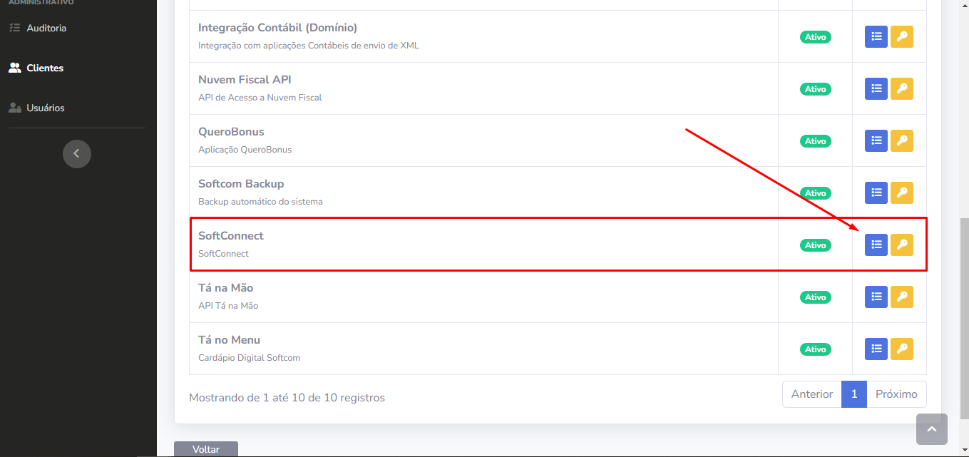 6 - Após salvar, o Produto Softconnect está disponível na listagem de produtos, clique no botão de detalhes para visualizar as chaves da integração