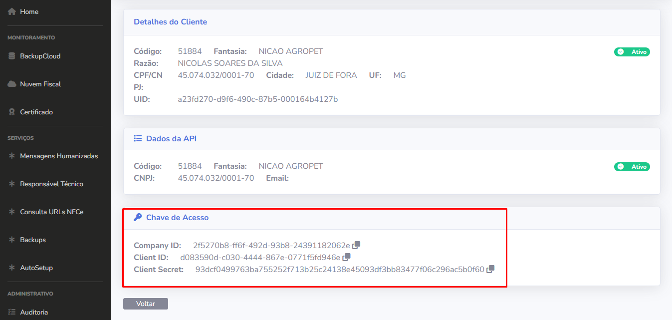 7 - Será redirecionado para a tela, com as chaves que serão necessárias para configurar o Softconnect