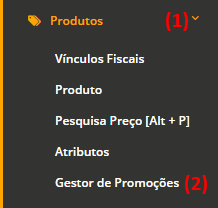 1 - Clicar no menu Produtos (1) do lado esquerdo da tela e na opção Gestor de Promoções (2).
