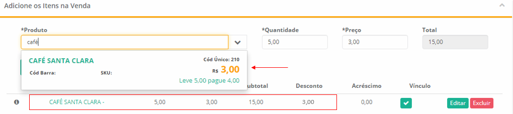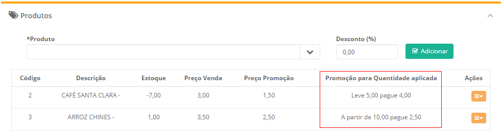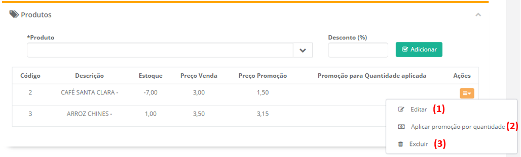 6 - No botão Ações podemos Editar um item já lançado (1), podemos aplicar a promoção por quantidade de itens vendidos (2) e excluir um item (3).