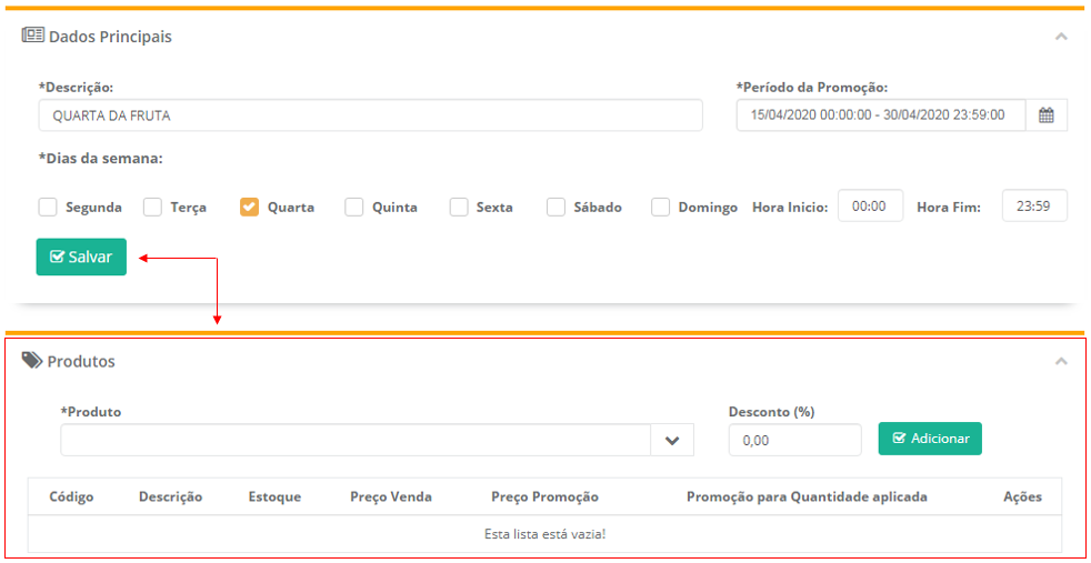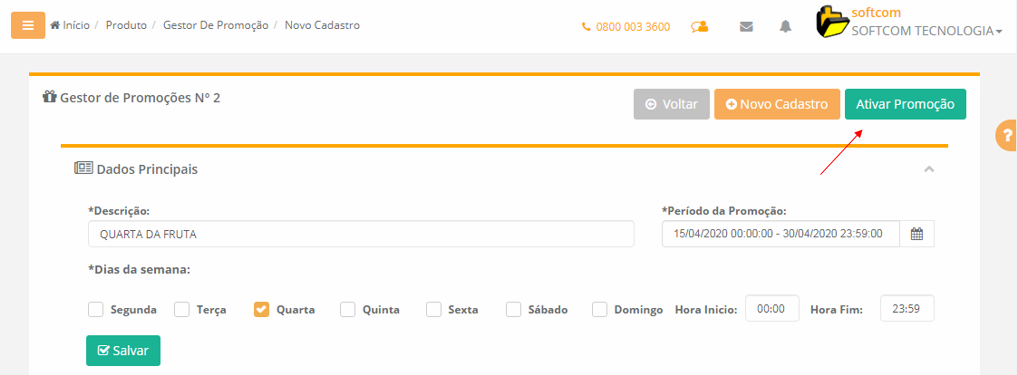 No nosso exemplo temos a Promoção Quarta da Fruta, no período de 15/04/2020 até 30/04/2020, com ativação apenas na quarta das 00:00 até as 11:59.