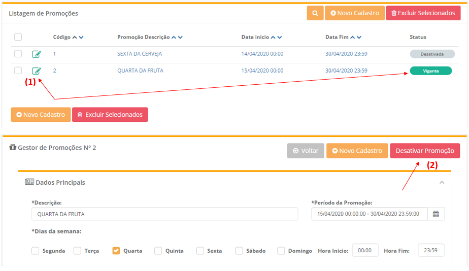 10 - Para desativar a promoção é só clicar no editar (1) da listagem e clicar no botão Desativar Promoção (2).