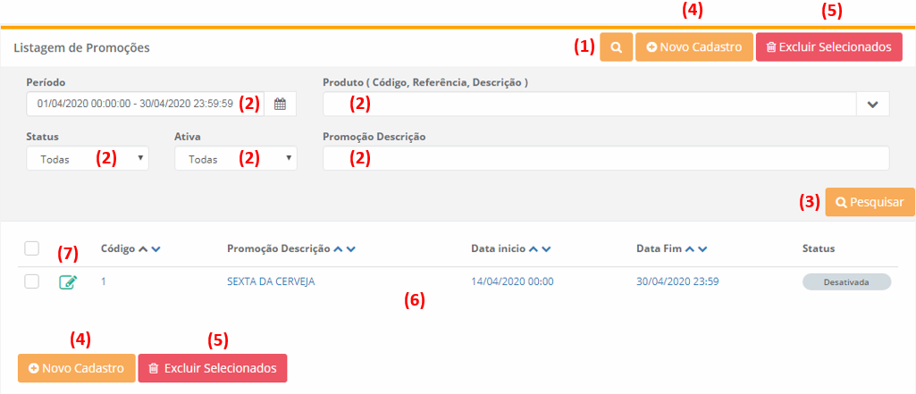 2 - Na tela de Listagem das Promoções podemos visualizar todas as promoções criadas. Temos a opção de pesquisar os registros existentes (1) que quando clicamos a página carrega os campos de Período, Produto, Status, Ativa e Promoção Descrição (2) para que o cliente possa informar os filtros desejados e após finalizar a pesquisa clicando em Pesquisar (3). Podemos criar uma nova Promoção (4) e excluir Promoções já existentes (5). Podemos visualizar a listagem das Promoções criadas (6) após um pesquisa ou quando abrimos a tela. Na listagem das Promoções podemos escolher uma já cadastrada e editá-la (7).