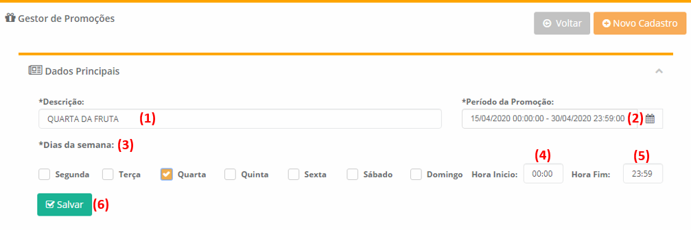 3 - Clicando em Novo Cadastro podemos criar uma nova promoção. De início informamos um nome para a promoção (1), informamos o período (2), o dia ou dias que essa promoção terá validade (3), o intervalo de horas no dia (4 e 5) e clicamos no botão Salvar (6) para que possamos avançar para a próxima etapa.
