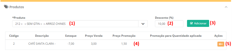 5 - O lançamento dos itens é realizado informando o nome do produto (1), o desconto que você quer adicionar ao item que vai entrar na promoção (2) e clicando no botão adicionar (3) para finalizar o processo de escolha do produto e lança-lo na listagem (4). Podemos ainda editar o tipo de promoção clicando no botão Ações (5).