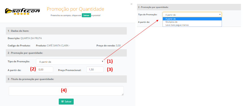 7 - Para Aplicar promoção por quantidade ao item devemos escolher qual o tipo de promoção (1), informar suas quantidades (2) e o valor promocional (3). Podemos inserir um nome para a Promoção no item (4) que é definido também automaticamente quando se escolhe a promoção.
