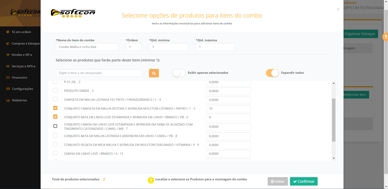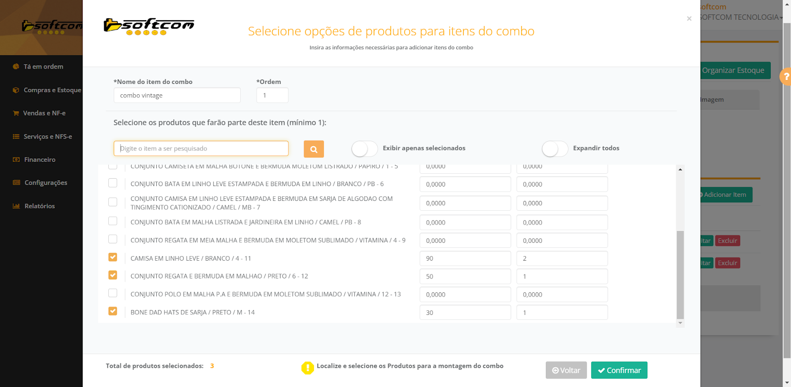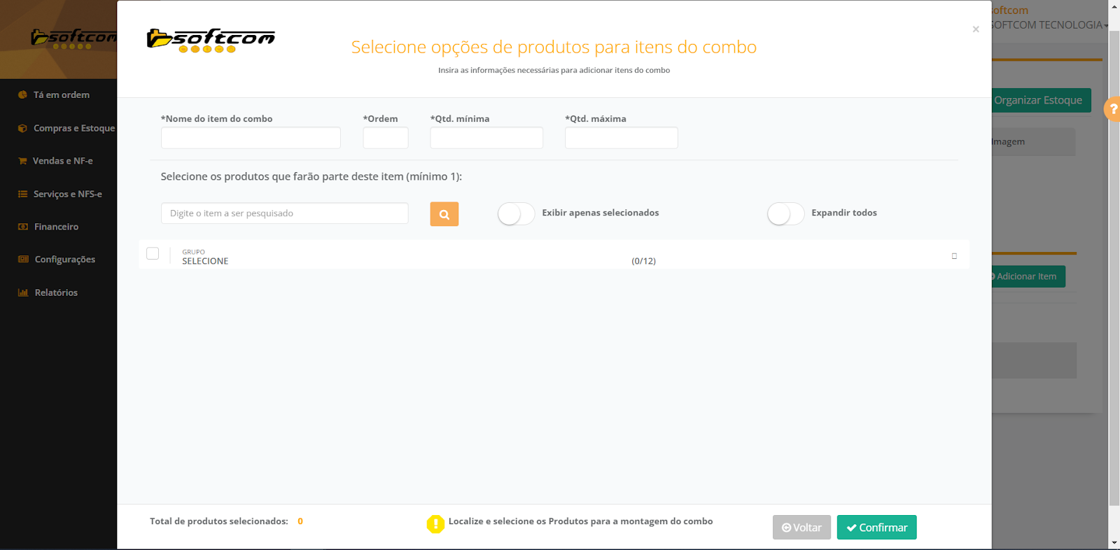 7- Na tela de Adição de itens no combo teremos: