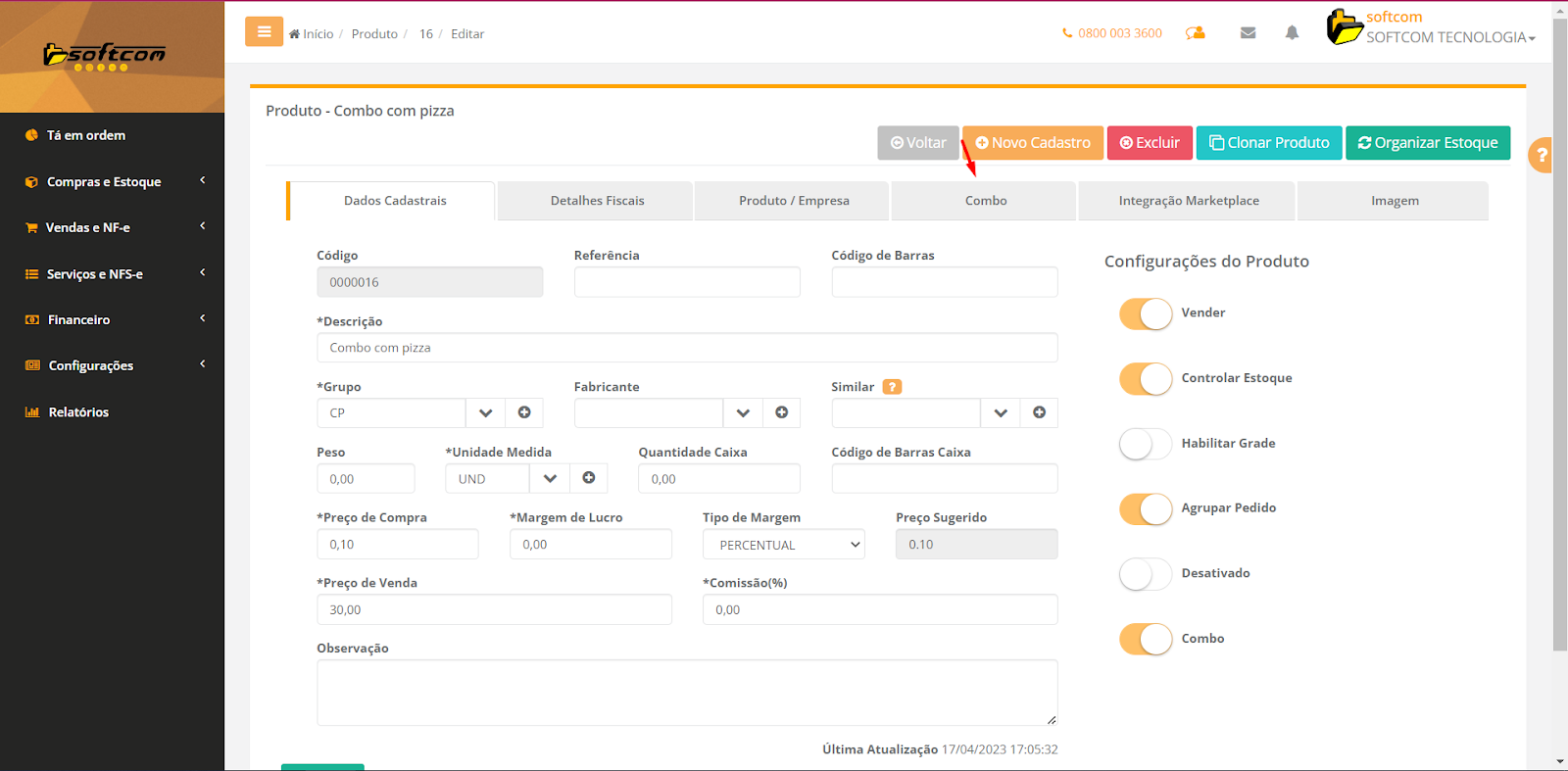 4-No cadastro do produto, clicar na aba Combo