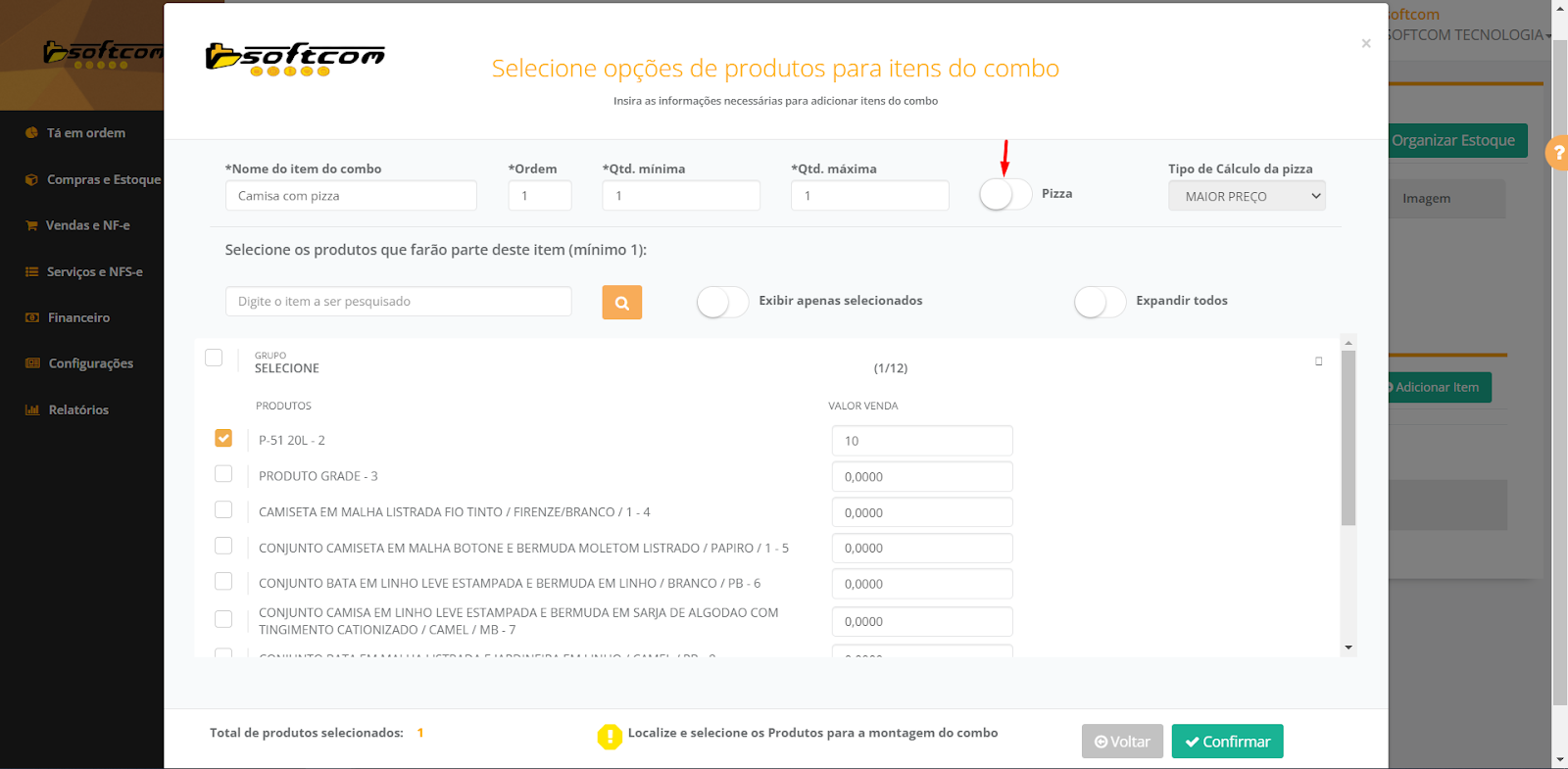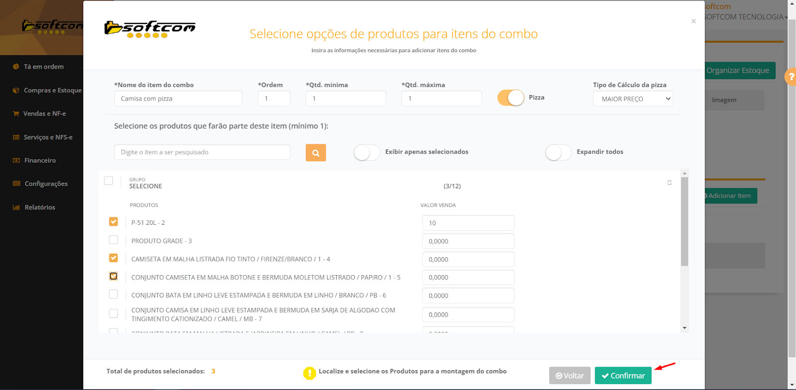 8-Após seleção do Tipo Cálculo da Pizza e seleção de mercadorias basta clicar em Confirmar