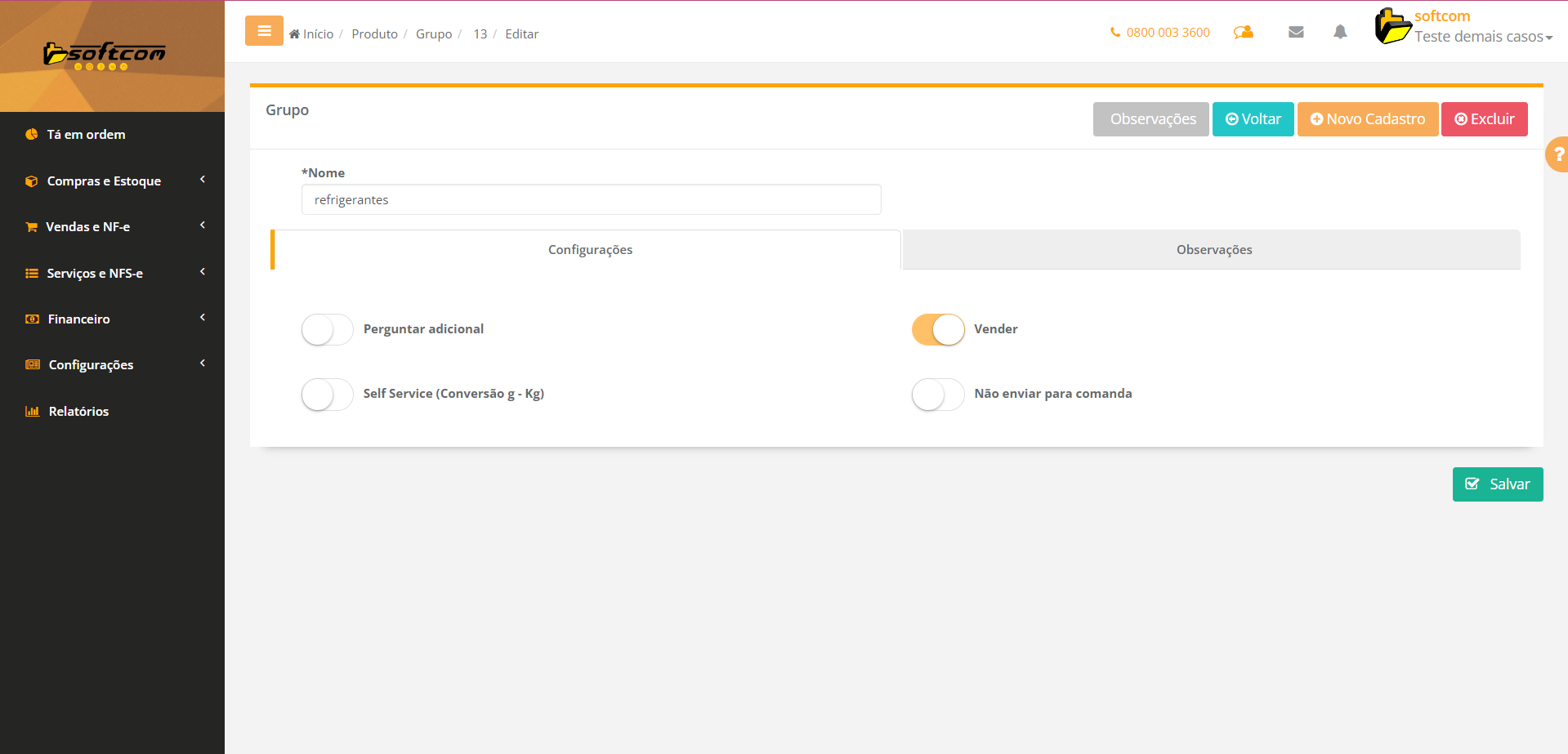 Não enviar para comandar: Quando habilitado não enviará os produtos vinculados ao grupo para comanda eletrônica.