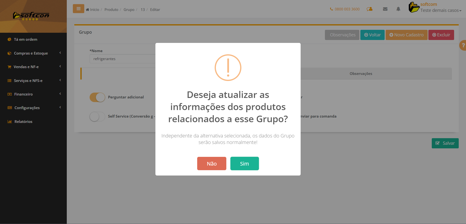 Ao clicar em Sim, serão atualizados todos os produtos vinculados ao grupo de acordo com a alteração realizada no grupo.