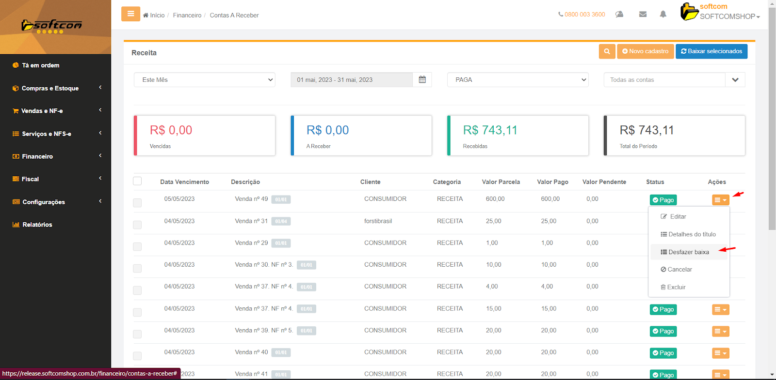 Softcomshop>Financeiro: Como desfazer baixa no contas a pagar/receber?