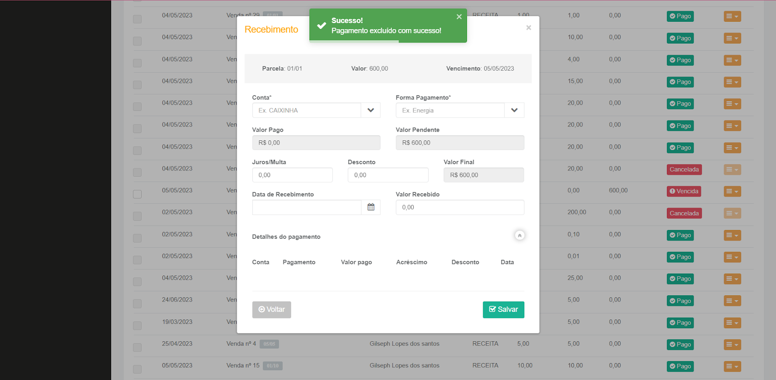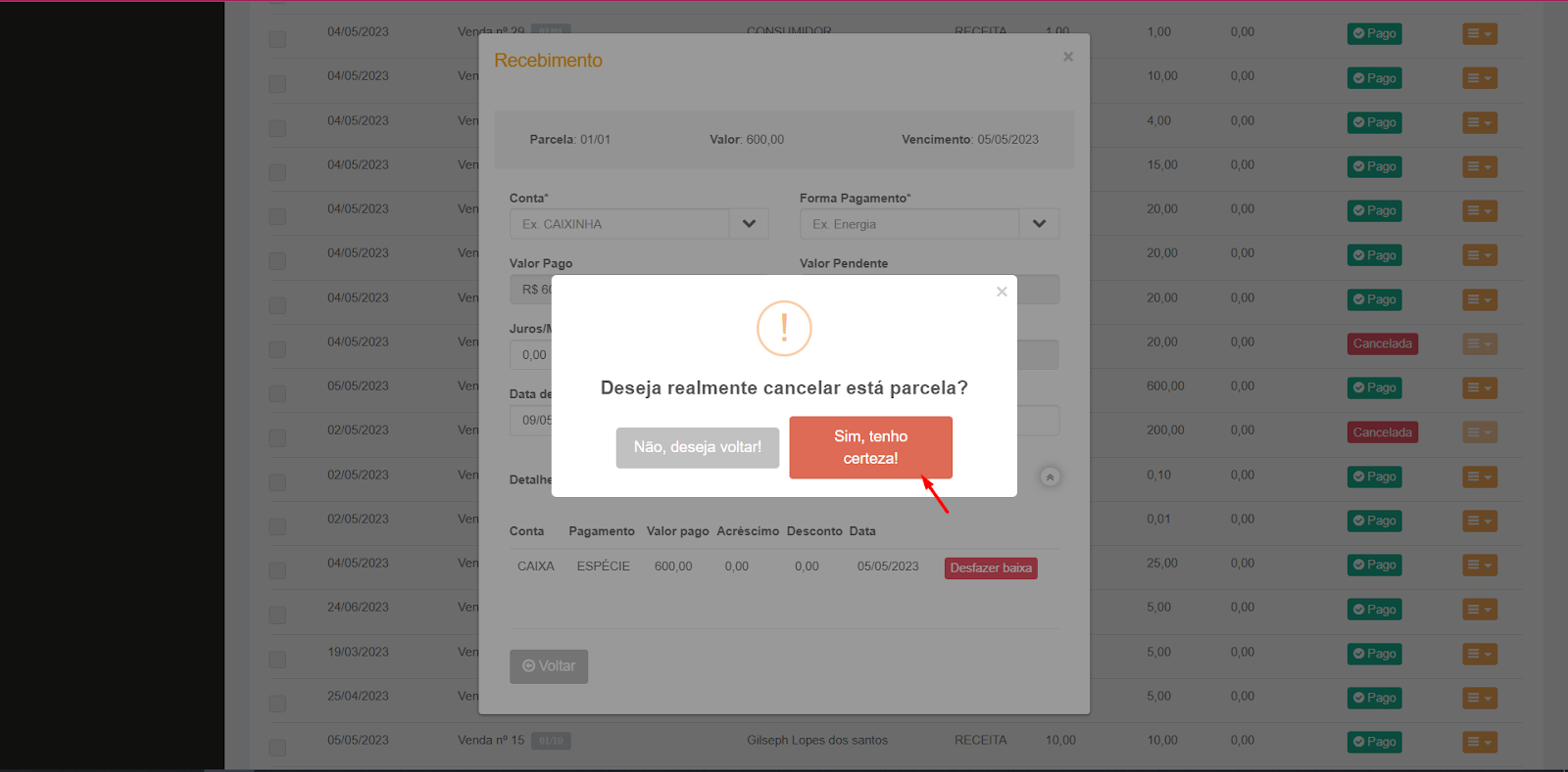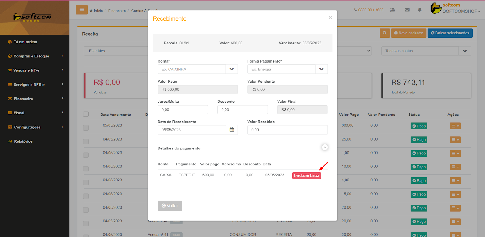 5-Na tela de Recebimentos, na seção Detalhes do Pagamento, localizar o pagamento desejado e clicar em Desfazer Baixa.