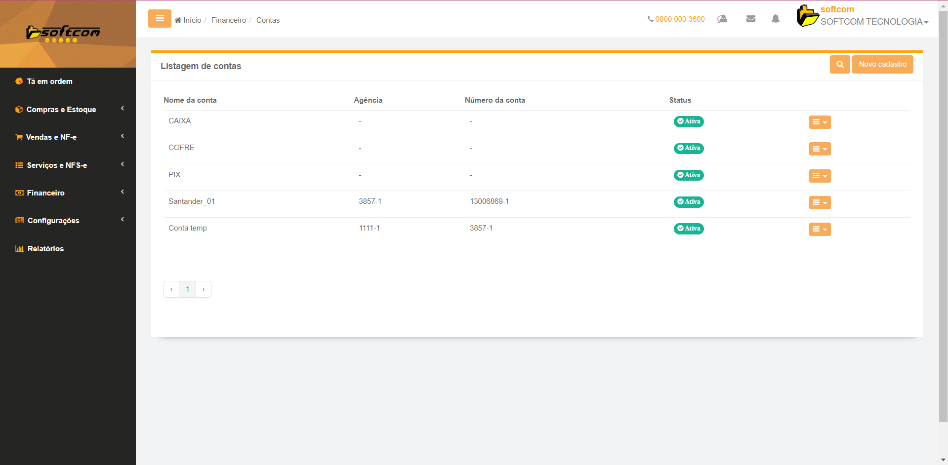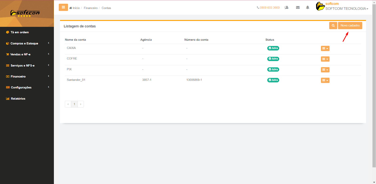 2 - Na listagem de contas clicar em Novo Cadastro