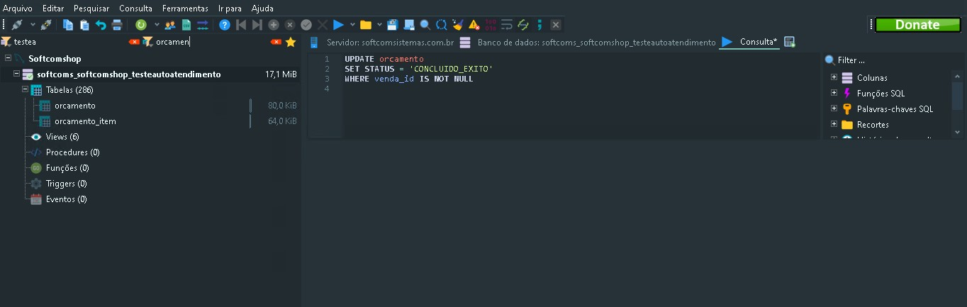 Realiza a seguinte consulta no HeidiSQL do Softcomshop que irá atualizar somente os orçamentos que possuem vendas vinculadas no campo venda_id.