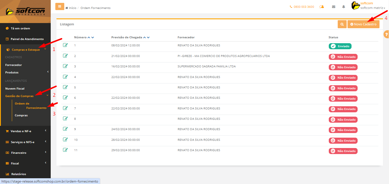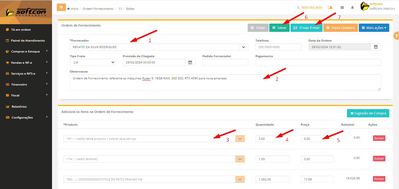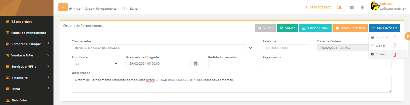 Softcomshop>Compras e Estoque>Gestao de Compras>Ordem de Fornecimento