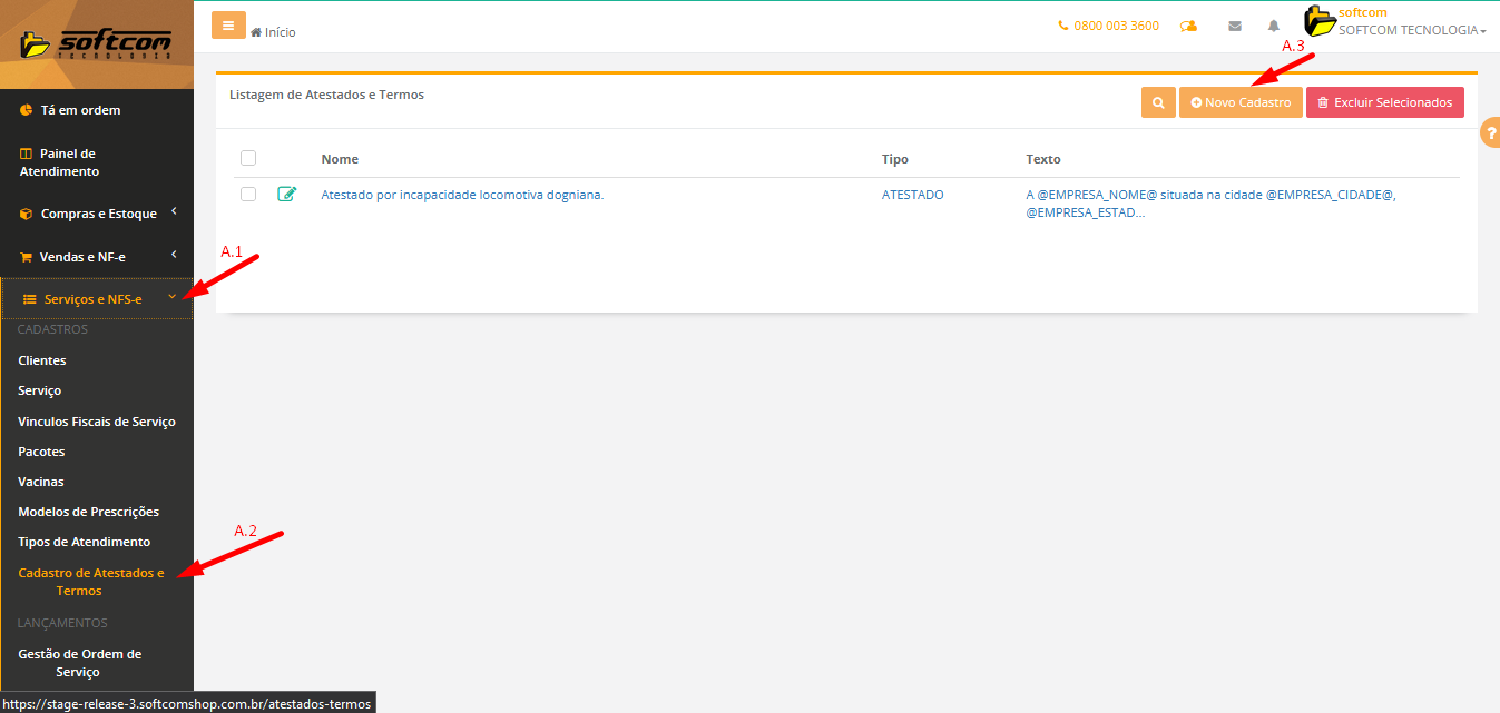 A.1 Serviços e NFS-e A.2 Cadastro de Atestados e Termos A.3 Clicaremos no botão ' Novo Cadastro '