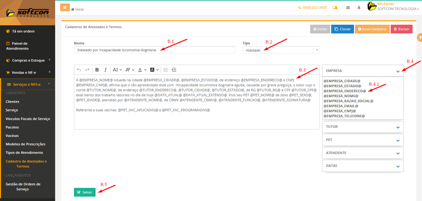 Nome do Atestado/Termo no B.1 , Tipo que será gerado B.2 , Conteúdo da mensagem que será preenchido com base nas inserções das TAGS no B.4 e B.4.1 para que o próprio sistema alimente as TAGS com os dados cadastrados no Sistema das rotinas de Petshop no Painel de Atendimento e por fim clicaremos em Salvar no B.5 .