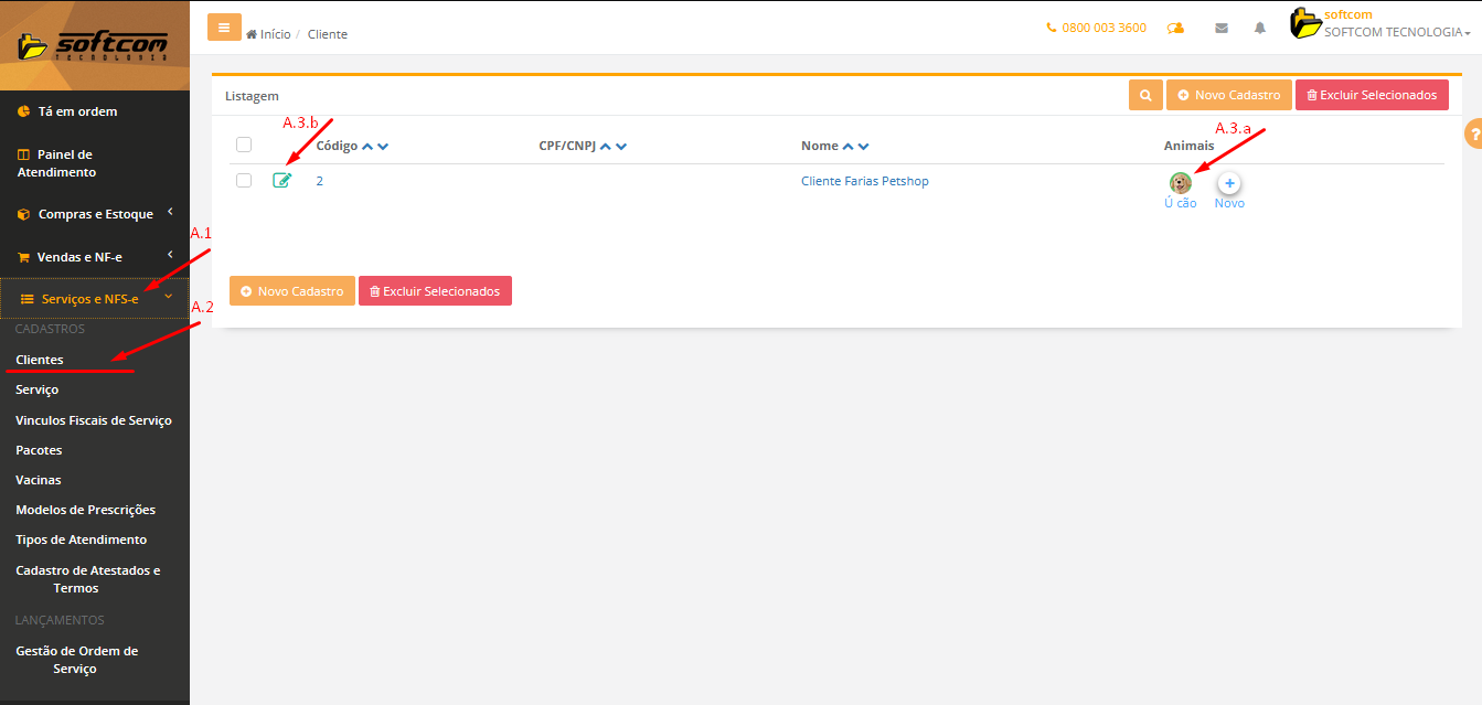 A.1 Serviços e NFS-e A.2 Clientes A.3.a Clicaremos na ultima coluna Animais caso já tenha cadastrado do contrário terá que cadastrar selecionando o cliente no A.3.b lápis e