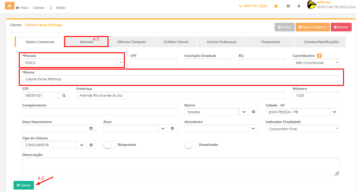preencher todos os campos obrigatórios em A.5 realizando o preenchimento na aba Animais. A.6 Salva