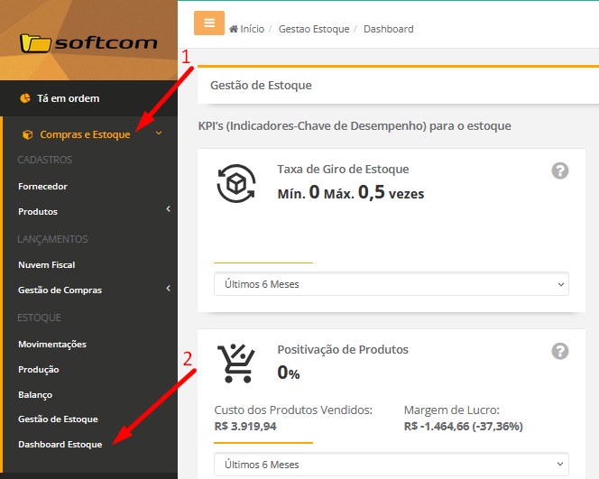 Softcomshop Dashboard Estoque: KPI's de Desempenho