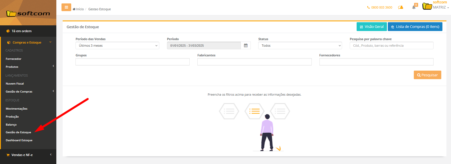 O botão de Produtos irá redirecionar para a página de Gestão de Estoque