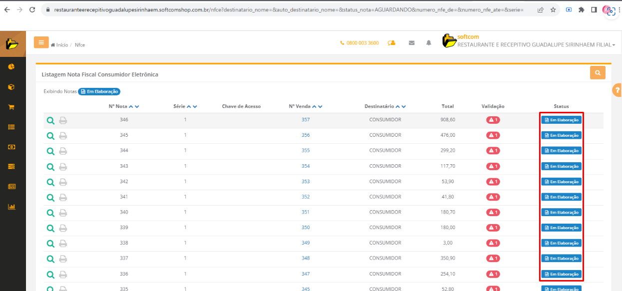 Softcomshop - Rejeição NFCe: Vários registros em rejeição, porem com status de elaboração não sendo possível fazer o reenvio