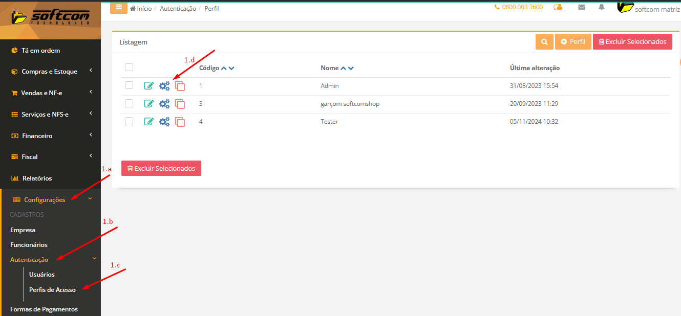 1.a Configurações 1.b Autenticação 1.c Perfis de Acesso 1.d Engrenagem(Permissões do Perfil)