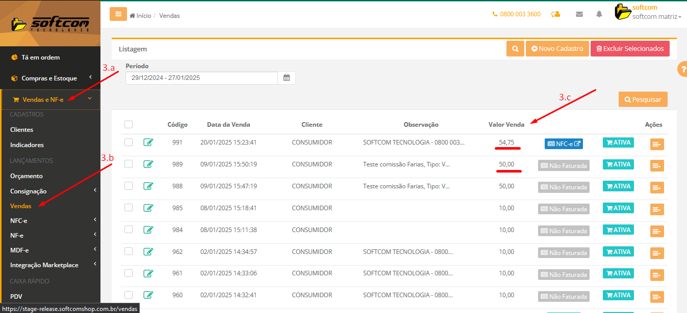 3.a Vendas e NF-e 3.b Vendas 3.c a nova coluna será exibida "Valor Venda"