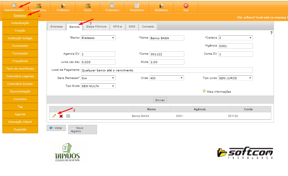 A. 1- ADMINISTRATIVO > 2- EMPRESA (SELECIONA A EMPRESA QUE ESTA SENTO HOMOLOGADA) > 3- ABA BANCO > NOVO REGISTRO ou 4- CLICAR NO LAPIS PARA EDITAR O BANCO JÁ EXISTENTE;
